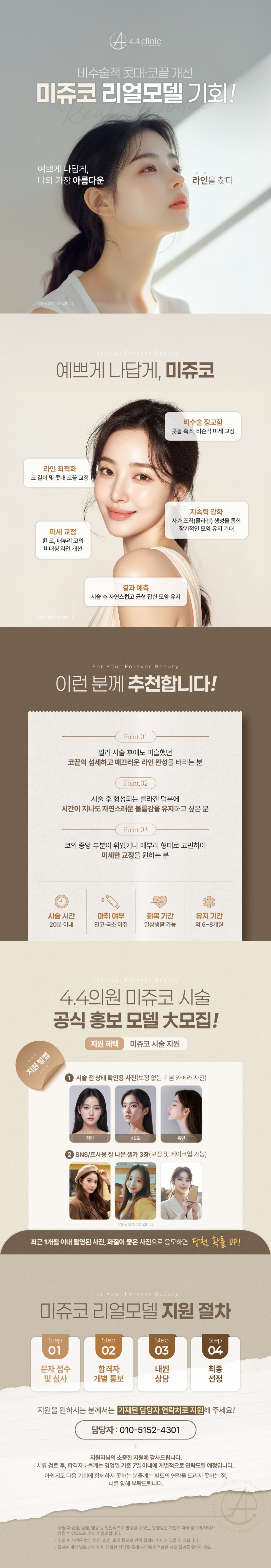4.4의원 미쥬코 리얼 모델 大모집 작성자관리자 등록일 25-11-27 조회86회 본문 ✨ 비수술 콧대 개선! 나의 가장 아름다운 라인을 찾다 ✨ [4.4의원 미쥬코 리얼 모델 大모집 - 시술 지원 혜택] 수술 없이 '예쁘게 나답게' 자연스러운 코 라인을 원하는 분들을 위해, 4.4의원 미쥬코 공식 홍보 모델을 모집합니다. 목록